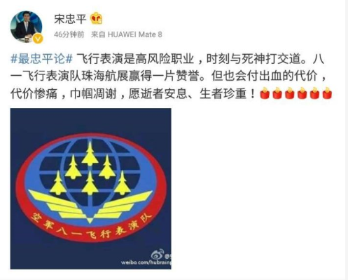 ▲2012年曾经和余旭共同参加过珠海航展飞行表演的战友也发微博哀悼