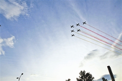2016年7月8日,在波兰首都华沙,波兰空军飞行表演队从北约峰会会场上空飞过。这次峰会上,北约成员国领导人做出加大在中东欧军事存在的决定。新华社记者 石中玉摄