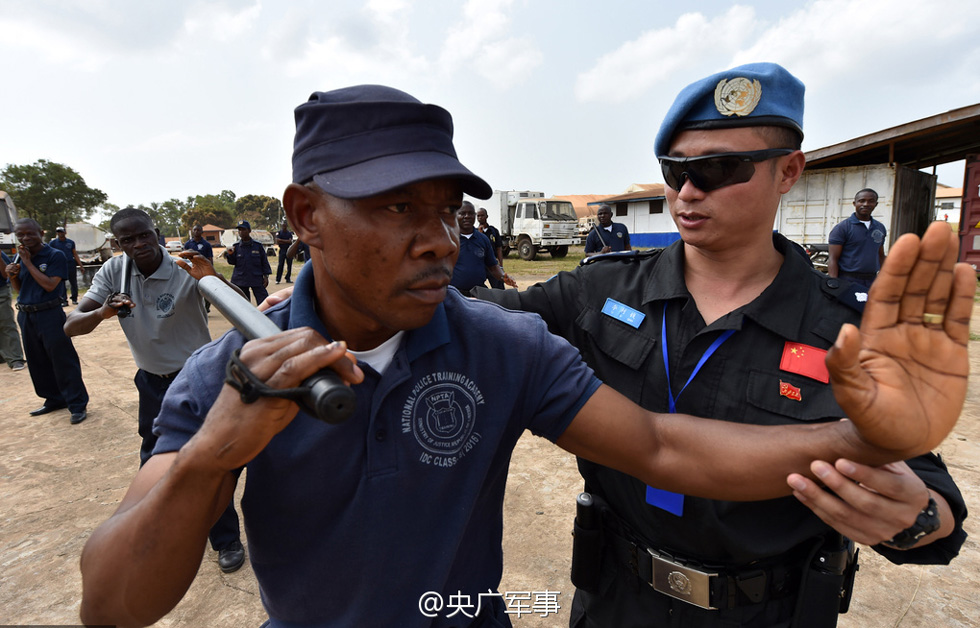 据央广军事微博消息,当地时间2017年1月5日,利比里亚蒙罗维亚,中国第四支驻利比里亚维和警察防暴队队员向利比里亚警察传授伸缩警棍实战使用技巧。