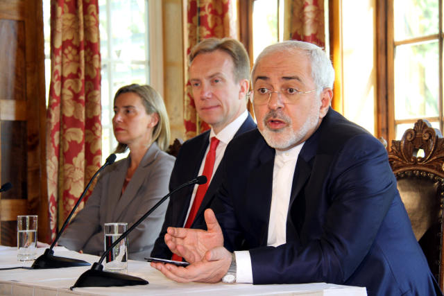 2016年 6月14日,在挪威首都奥斯陆,伊朗外交部长扎里夫(右)在记者招待会上讲话。(新华社记者 张淑惠摄)